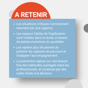 L’expérience de terrain montre que repérer les signaux faibles permet de comprendre ce qui évolue, avant que la situation ne se dégrade et ne nécessite des interventions plus lourdes.